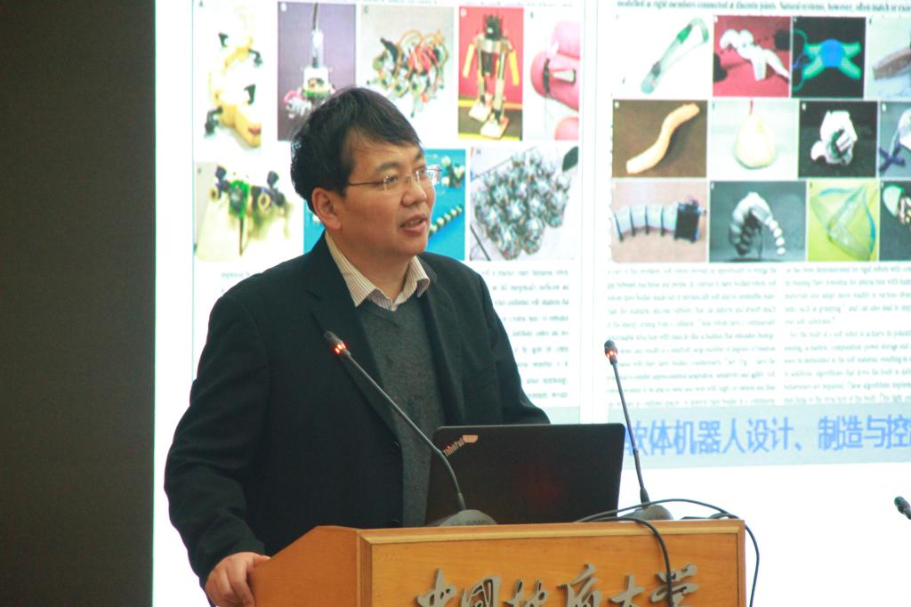 报告围绕共融机器人(能够与作业环境、操作者和其他机器人之间自然交互,自主适应复杂任务和动态环境的人--环境共融的机器人)的基础理论与关键技术,从研究概况、产业发展情况、发展趋势等几个方面展开。丁院士作为NSFC共融机器人重大计划的指导专家组组长,从高校科研的角度对该计划进行介绍,展示了团队自助研制的风电叶片多机器人协同打磨装备,并与在座的师生分享了做科研的心得:做科研要坚持理论创新-技术突破-工程应用-产业引领的创新模式。