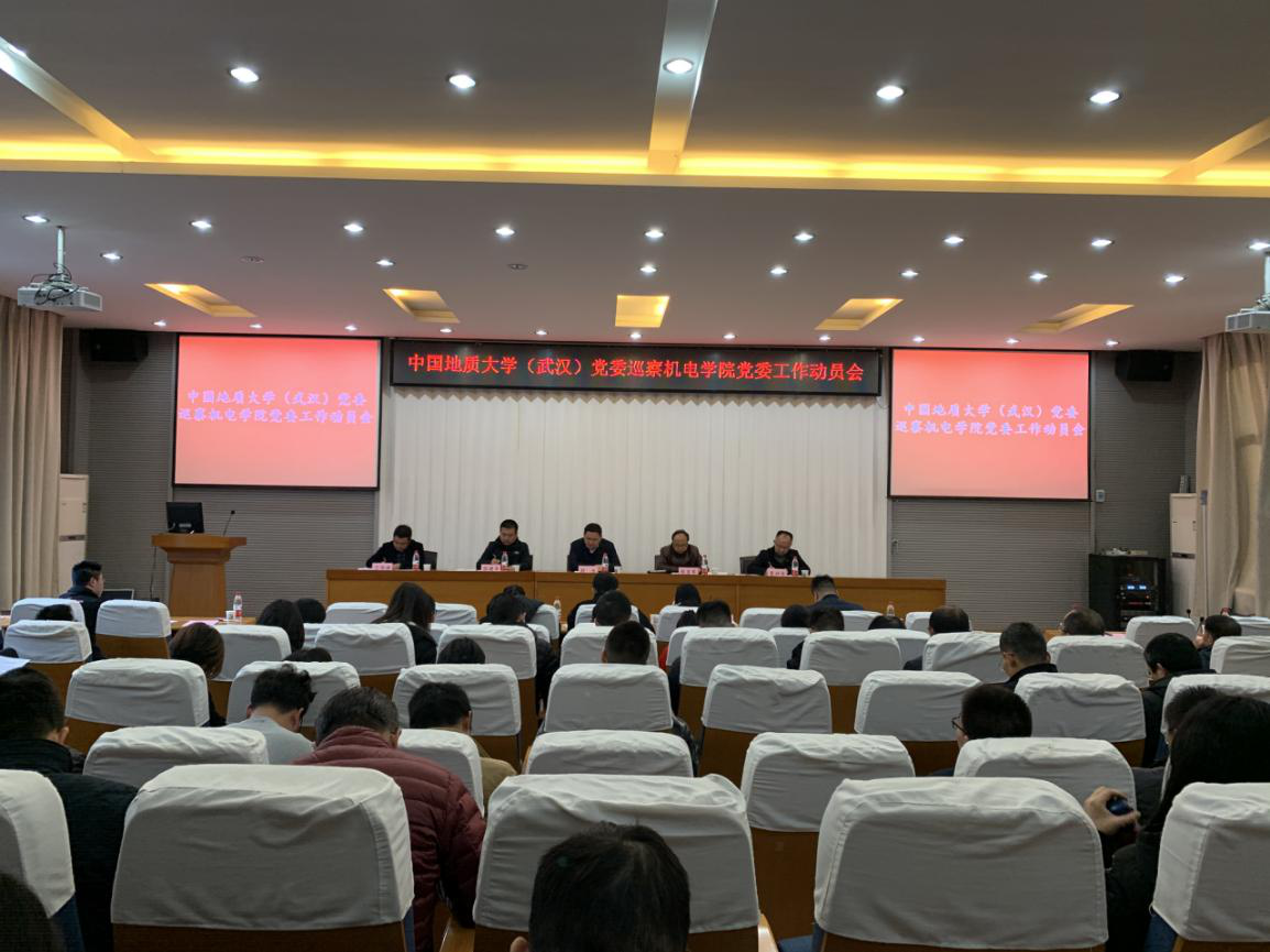 2018年12月12日下午2:30,中国地质大学(武汉)党委巡察MILE米乐官方网站党委工作动员会在教二楼301报告厅召开。校党委常委、副校长刘杰,校监察处副处长李杰,校党委第三巡察组成员张吉军、张建华、高莹莹、王向东、陈红霞,学院全体教职工、离退休老同志代表、学生代表等90余人参加会议。院长丁华锋主持会议。