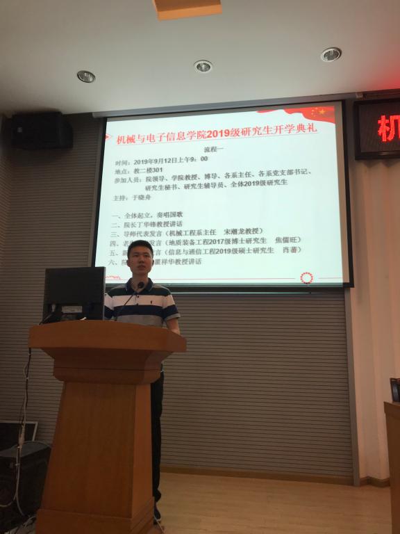 老生代表、地质装备工程2017级博士研究生焦儒旺发言。他结合自身开展学术科学研究的经历,从学习态度、学习方法、科学道德等方面向研究生新生们给出了切实建议与鼓励。