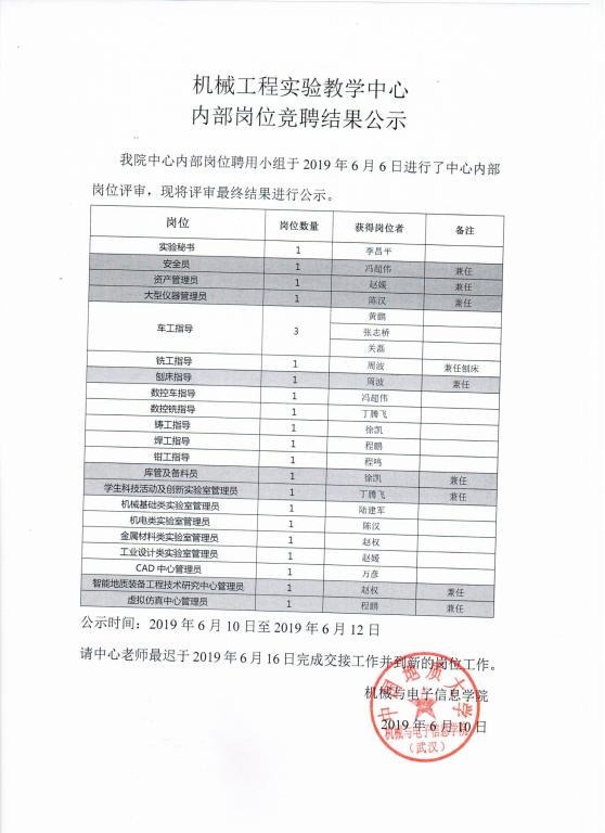 机械工程实验教学中心内部岗位竞聘结果公示