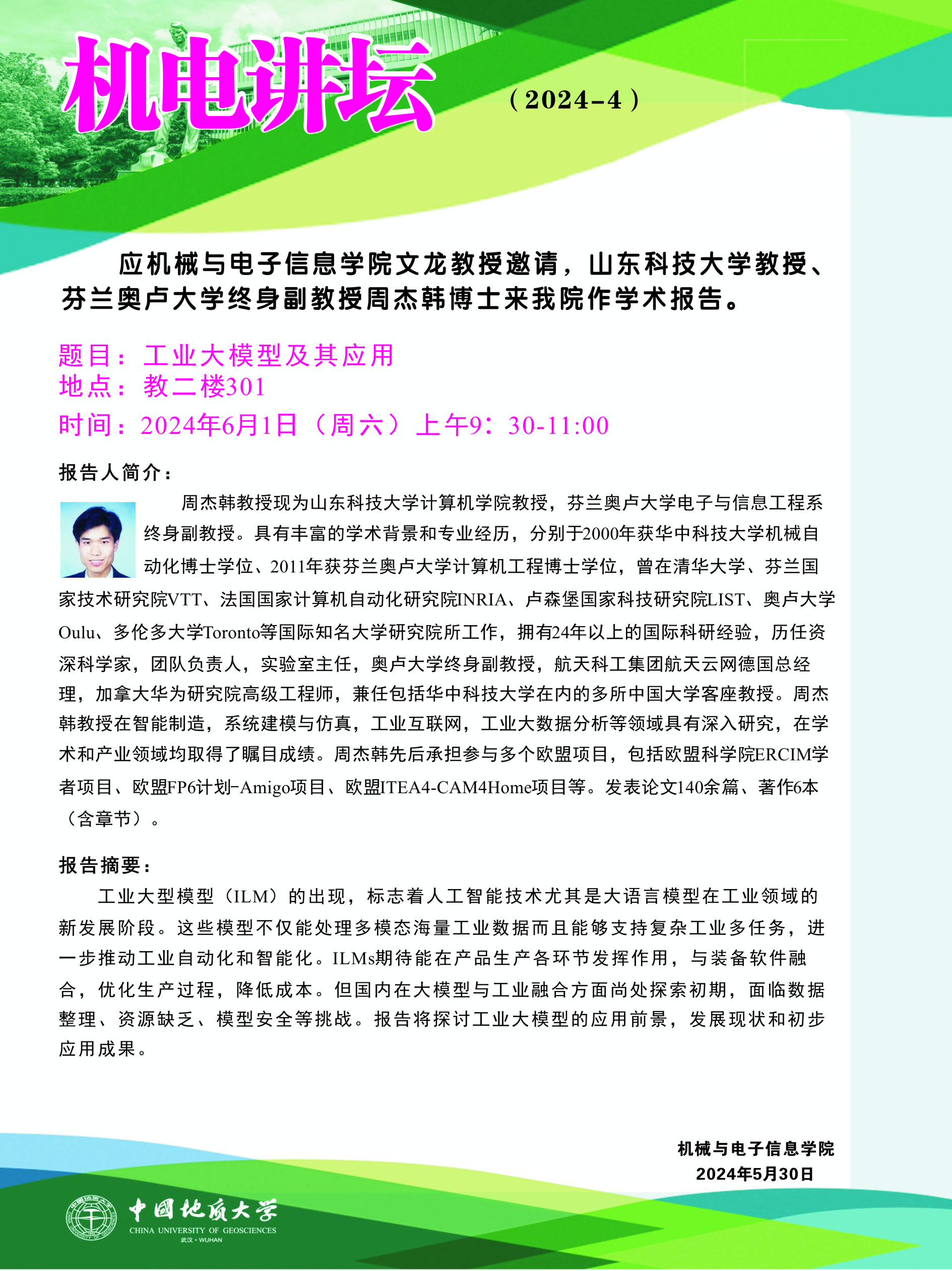 【6月1日】机电讲坛(2024-4):山东科技大学教授、芬兰奥卢大学终身副教授周杰韩博士来MILE米乐官网作学术报告会