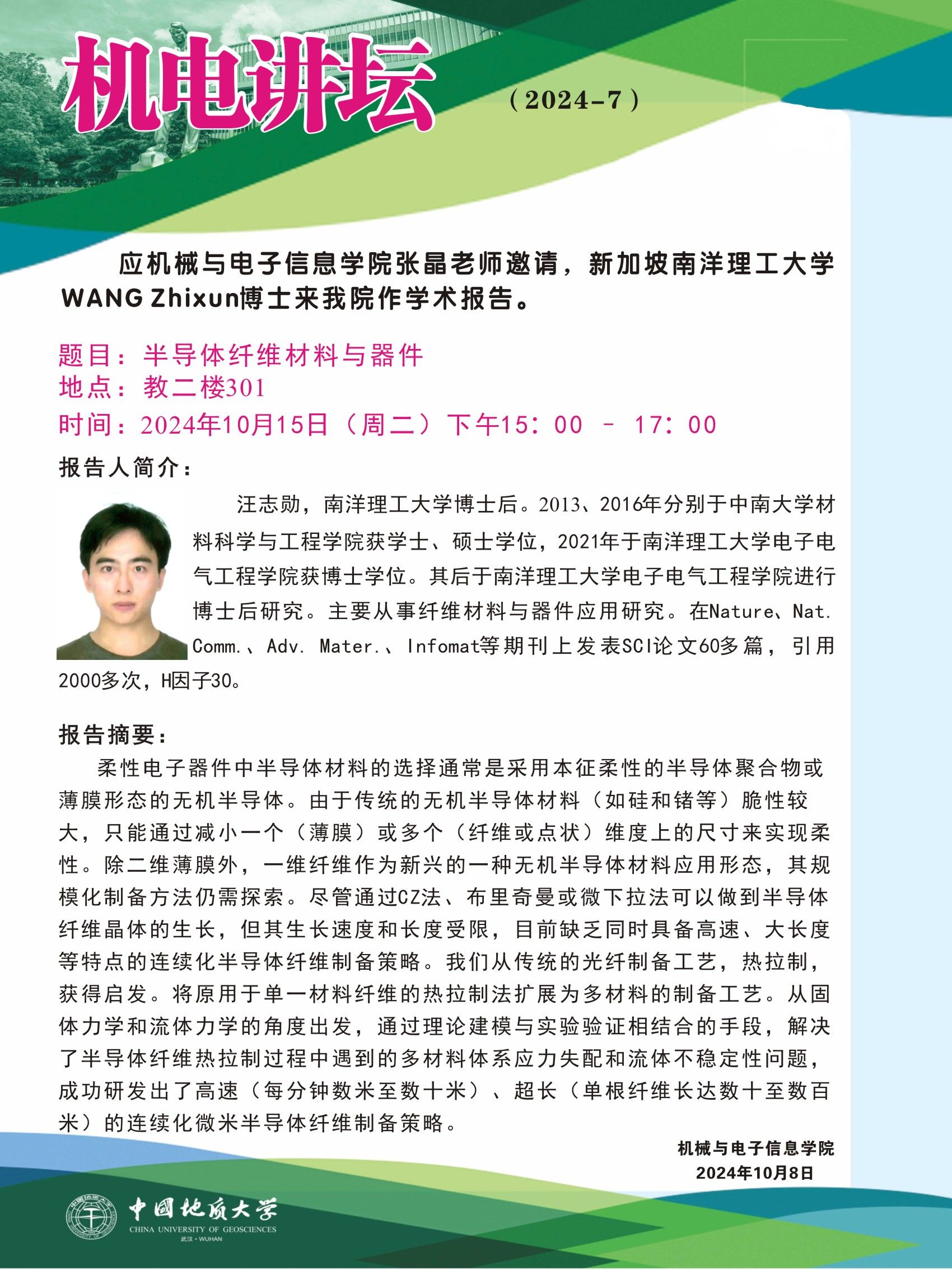【10月15日】机电讲坛(2024-7):新加坡南洋理工大学WANG Zhixun博士来MILE米乐官网作学术报告