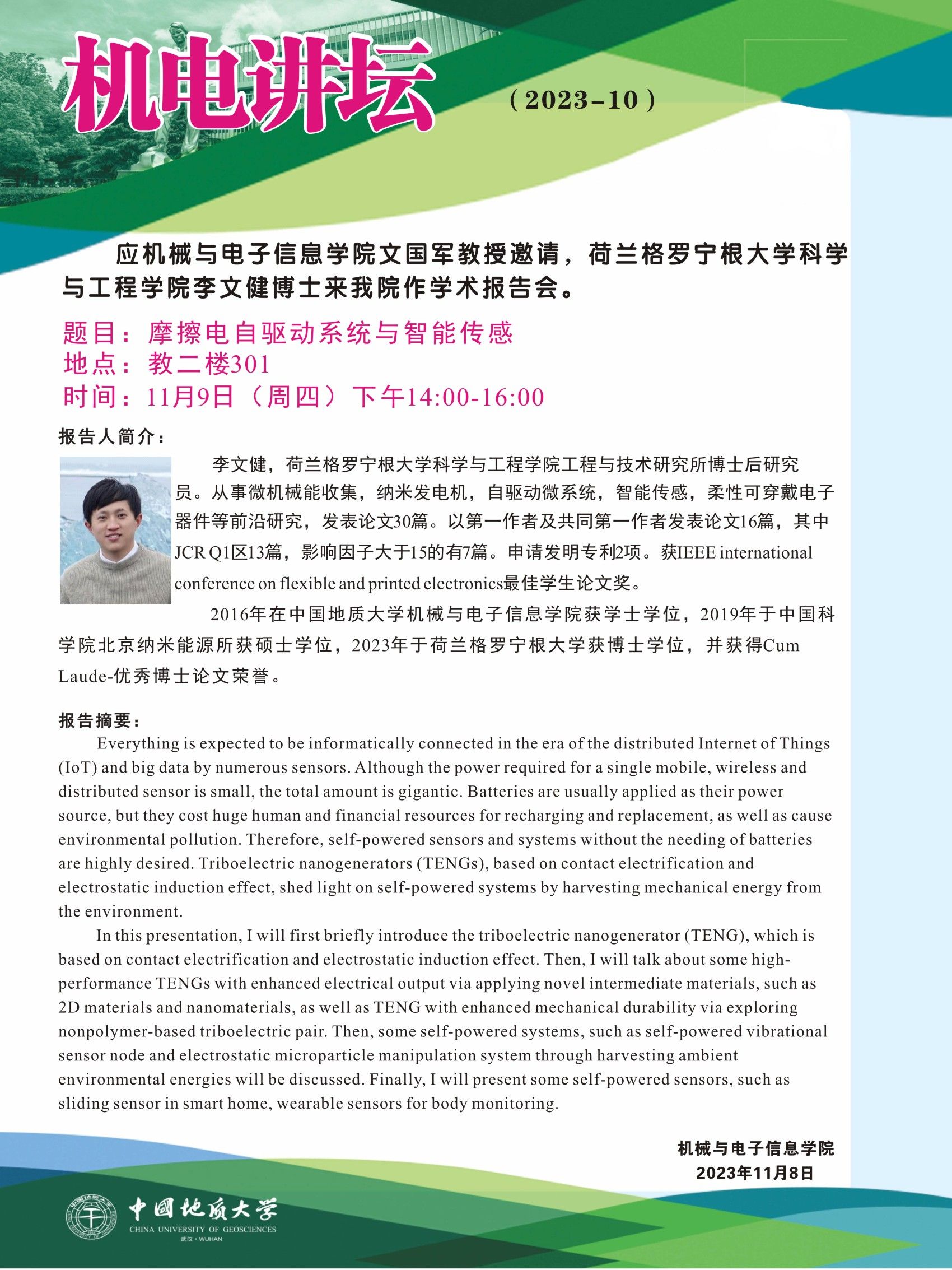 【11月9日】机电讲坛(2023-10):荷兰格罗宁根大学科学与工程学院李文健博士来MILE米乐官网作学术报告会