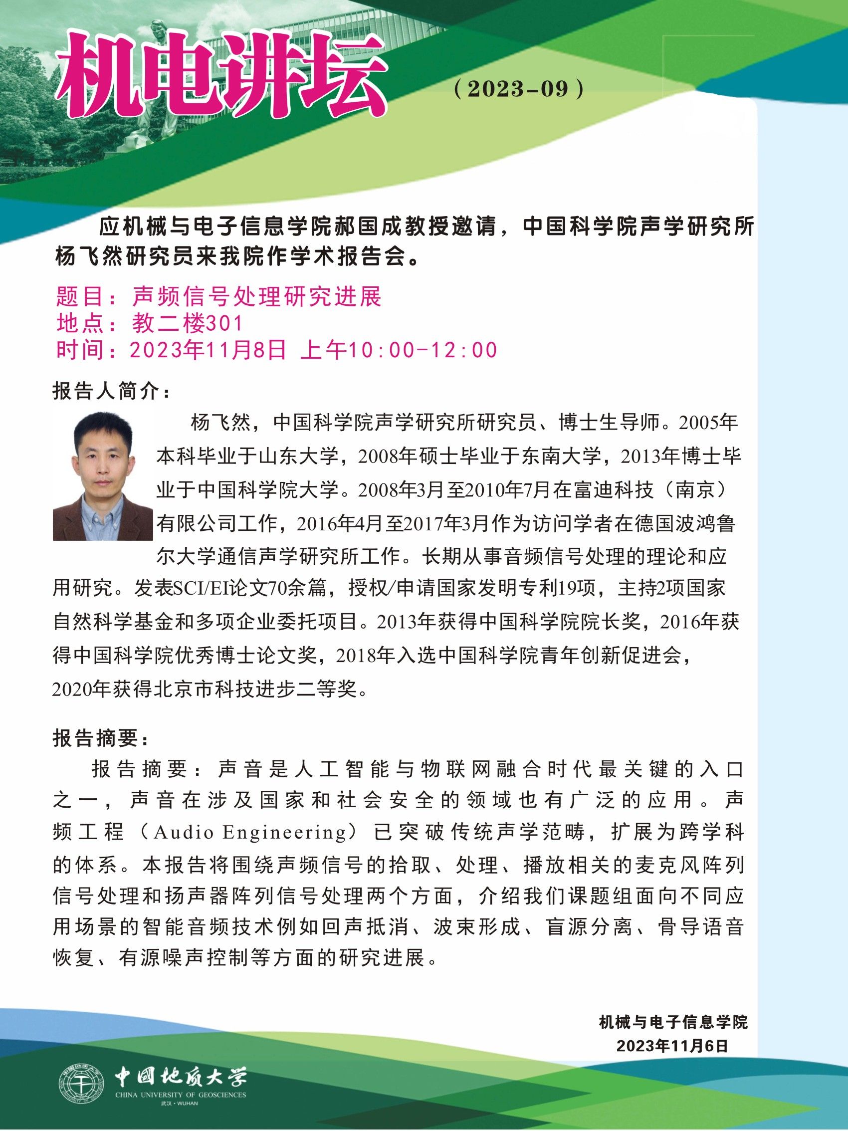 【11月8日】机电讲坛(2023-9):中国科学院声学研究所杨飞然研究员来MILE米乐官网作学术报告会
