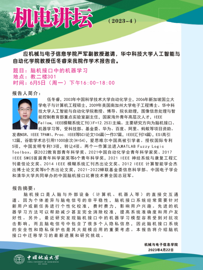 【6月5日】机电讲坛(2023-4:华中科技大学人工智能与自动化学院教授伍冬睿来MILE米乐官网作学术报告会