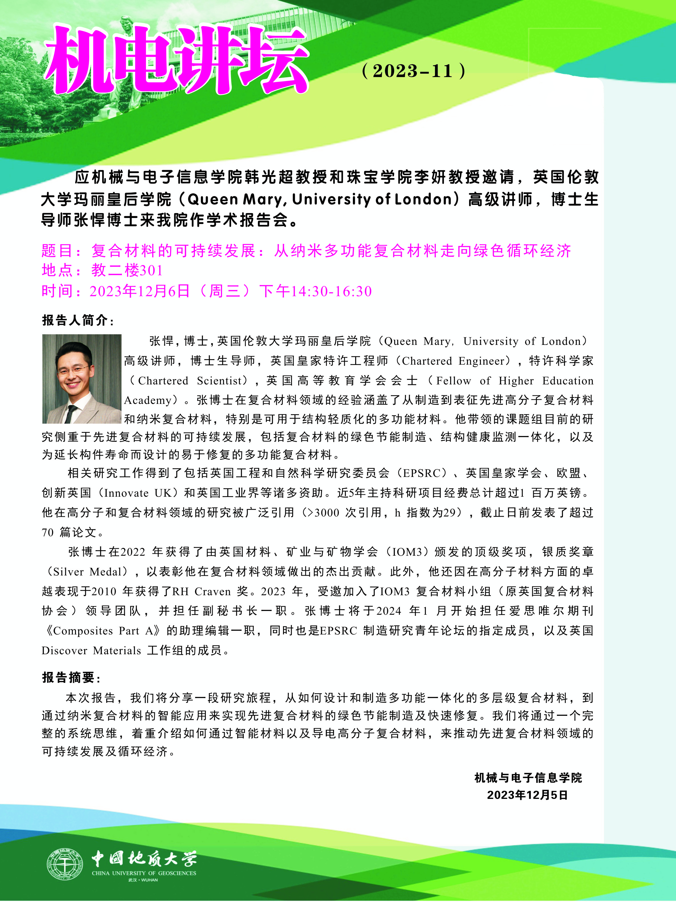 【12月6日】机电讲坛(2023-11):英国伦敦大学玛丽皇后学院张悍博士来MILE米乐官网作学术报告会