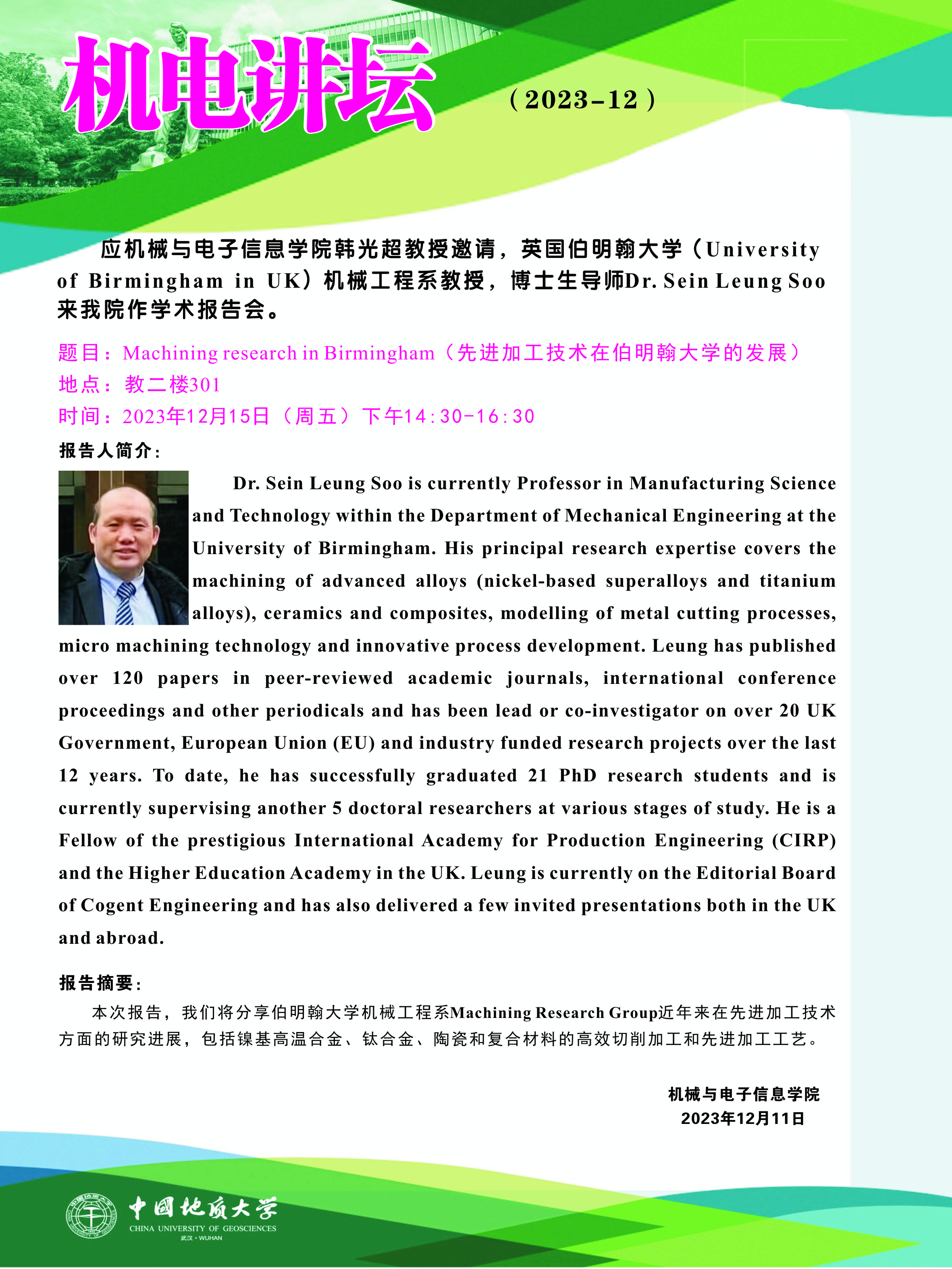【12月15日】机电讲坛(2023-12):英国伯明翰大学Dr. Sein Leung Soo来MILE米乐官网作学术报告会