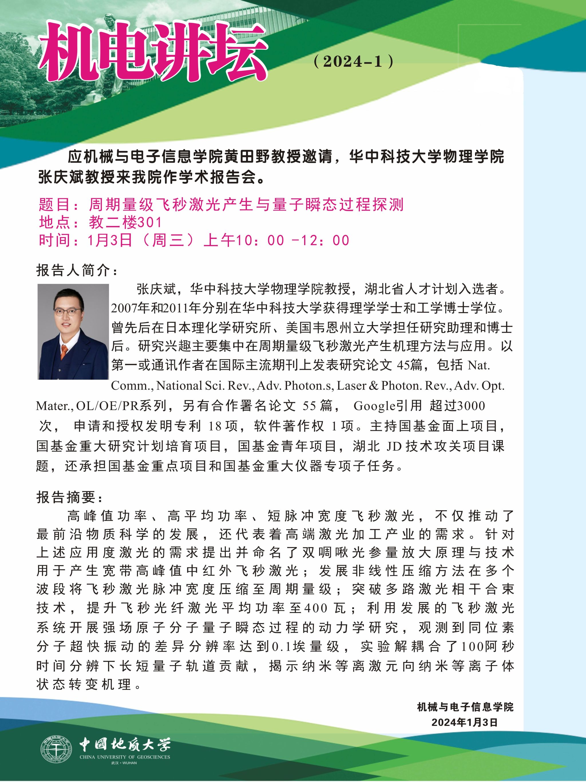 【1月3日】机电讲坛(2024-1):华中科技大学物理学院张庆斌教授来MILE米乐官网作学术报告会