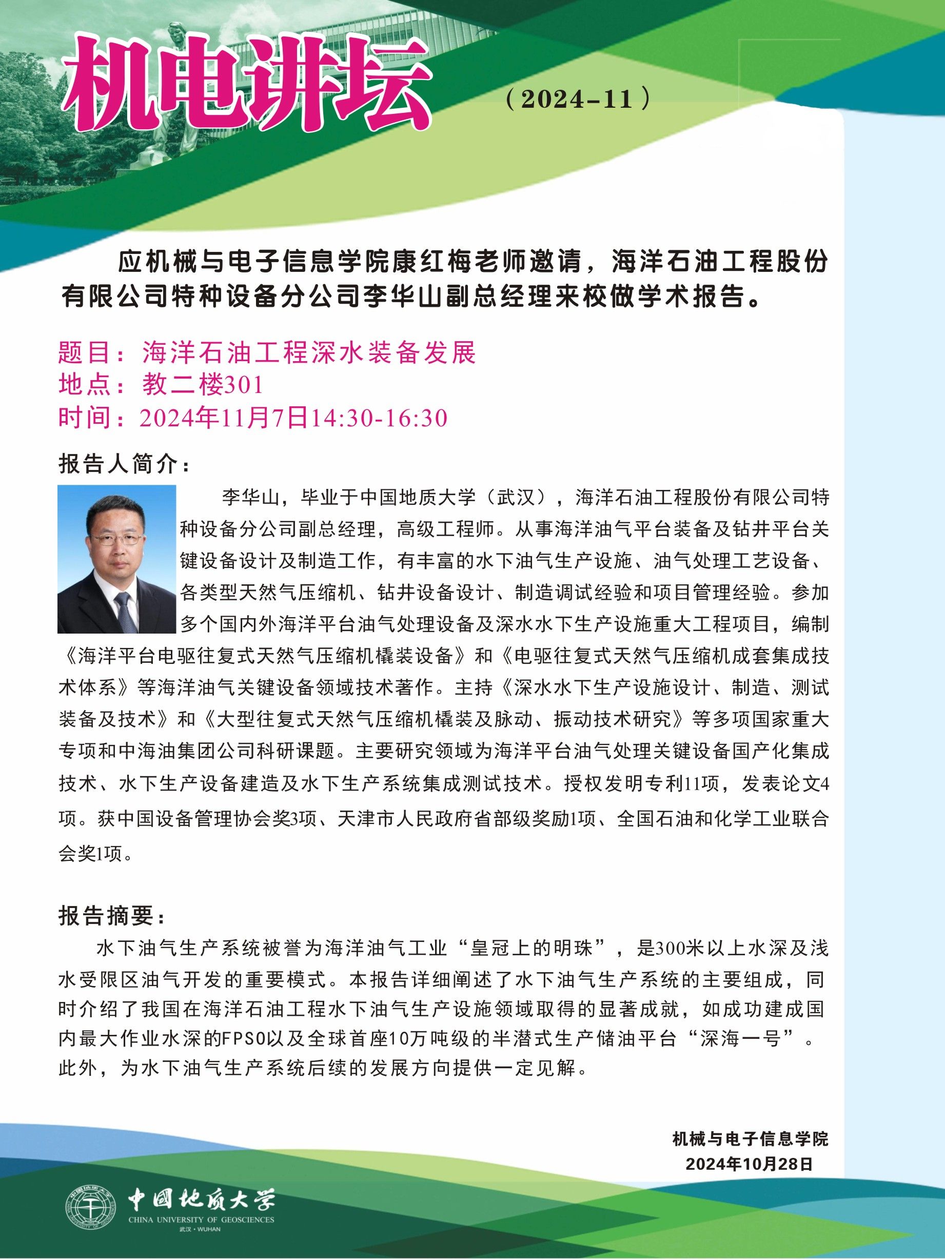 【11月7日】机电讲坛(2024-11):海洋石油工程股份有限公司特种设备分公司李华山副总经理来MILE米乐官网作学术报告