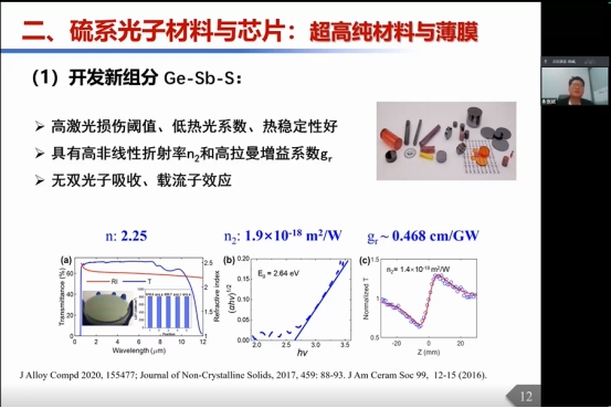 在报告中,张教授指出非线性集成光子学结合了现在的高精度的纳米加工技术和高非线性光学平台优势,显著增强了非线性光学的效率、带宽和相干性,革命性地实现了片上光学频率梳、宽带拉曼光源和片上量子光子学等应用。硫系光子材料和器件具有超宽带透光波段、较高的克尔非线性和拉曼效应、较低的热光系数等优势,被广泛应用于宽带非线性光子学应用中。