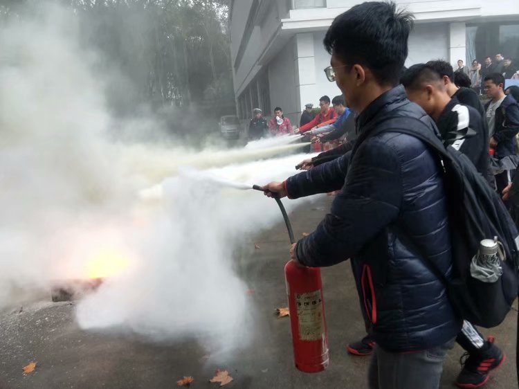 在西区体育馆门口,保卫处的老师手先向大家介绍了学校发生过的校内失火案例,进而告诉了大家一些生活中存在的火灾隐患。之后老师再为大家介绍了干粉灭火器和二氧化碳灭火器的使用方法和使用场所并实际演示了一遍,然后全体参与培训的成员一一进行灭火器灭火的实践操作。