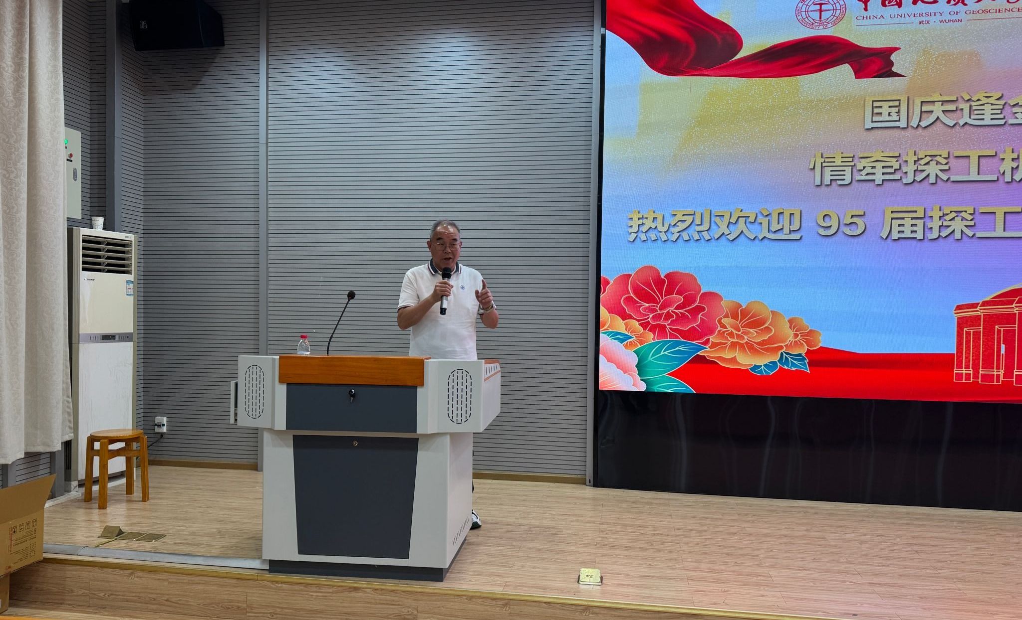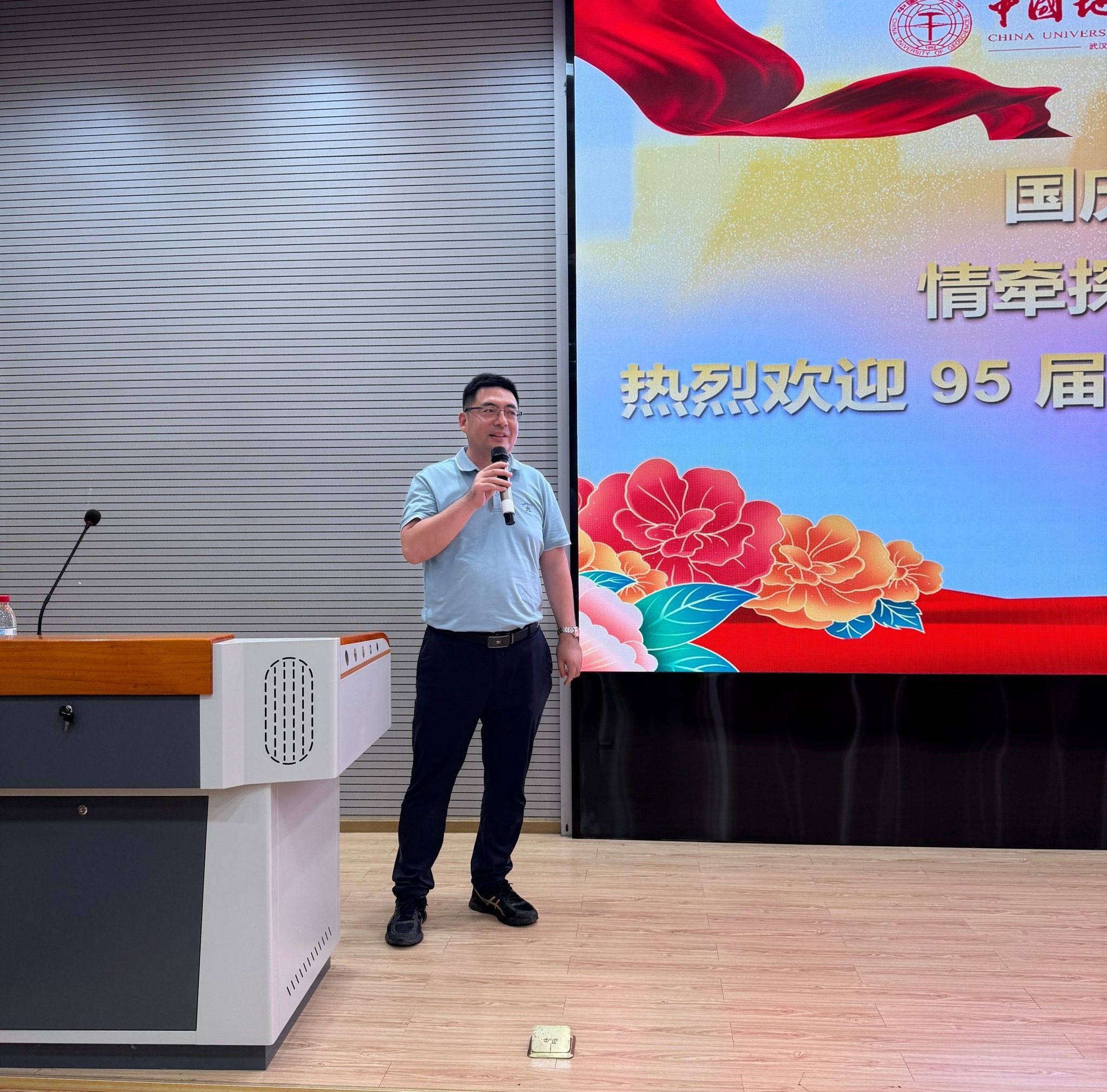 校友代表的发言则满含对母校的感恩与对青春的怀念。95 届探工系校友张绍红热情欢迎各位校友 “回家”,动情回忆起求学时与同窗一起上课、在东湖边畅谈理想、手持地质锤奔赴野外探索山河的青春片段;同时以“艰苦朴素,求真务实”的校训勉励在场学弟学妹,鼓励他们在人生道路上勇敢面对挑战、坚守初心。05 届机电系 72011 班校友于彦江则分享了毕业后的职业发展经历,着重强调“机电学院与工程学院本是一家”的深厚渊源,呼吁大家践行 “今天我以地大为荣,明天地大以我为荣”的信念,为母校与学院发展贡献力量,并送上美好祝福。发言期间,张绍红还特意为老教师们送上家乡特产,以朴素真挚的方式表达对恩师的感恩之情,现场氛围温馨动人。
